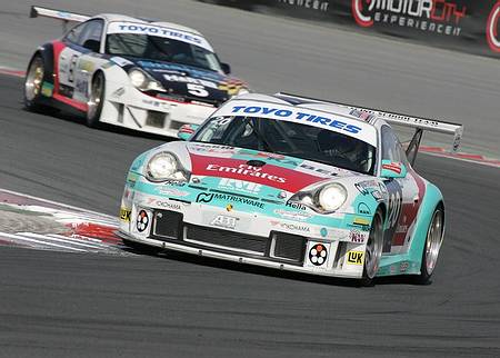 Raceleader Wolfgang Kaufmann vor dem Oktanas Porsche 996 RSR mit Uwe Alzen am Steuer