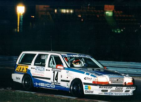 24h Rennen Nürburgring 1996, Wolfgang Kaufmann auf dem „Publikumsliebling“ VOLVO 850 T5 eingesetzt von HEICO Motorsport bei Nacht