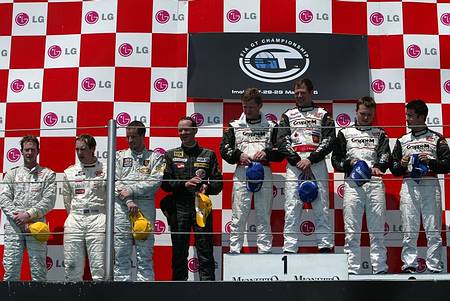 Podium FIA GT Meisterschaft Imola 2005. Verdienter 3. Platz für Wolfgang Kaufmann und Luca Moro (3. v.l.) im Lammertink Porsche GT 3 RSR.