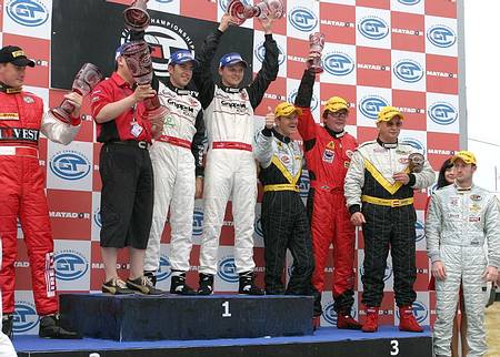 Die erfolgreiche, zu diesem Zeitpunkt noch drittplazierte Mannschaft von Renauer Motorsport auf dem Podium beim FIA GT Meisterschaftslauf in Brünn 2005. Wolfgang Kaufmann, Petr Valek und Manfred Jurasz wurden dann später noch auf Platz 2 gewertet.