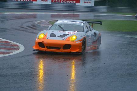 Wolfgang Kaufmann im A:Level Porsche auf regenüberfluteter Strecke beim Qualifying zum LMES Saisonauftakt in SPA 2005.