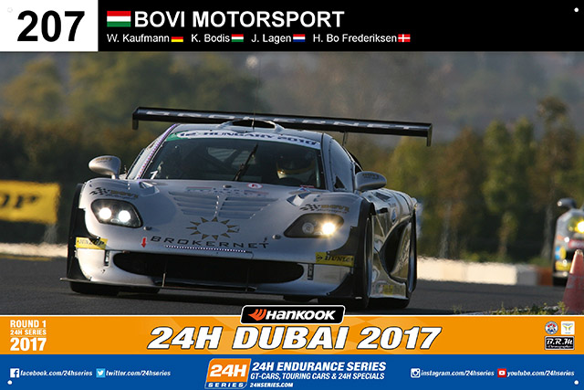 2017 teilt sich eine bunte Truppe das Cockpit. Neben Kaufmann sind dies der niederländische Rennprofi Jaap van Lagen, Heino Bo Frederiksen (DEN) und Kalman Bodis, dem Chef von Bovi Motorsport. Zwar ist die Klasse SP2 bei den 24h von Dubai stark besetzt, doch das Ziel ist klar: „Natürlich peilen wir wieder den Klassensieg an“, gibt sich Kaufmann zuversichtlich. „Vielleicht ist das ein oder andere Auto schneller, aber ein 24-Stunden Rennen hat seine eigenen Gesetze.“