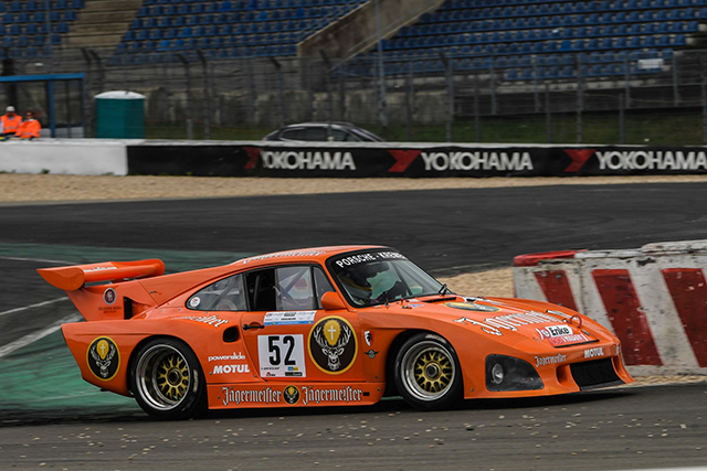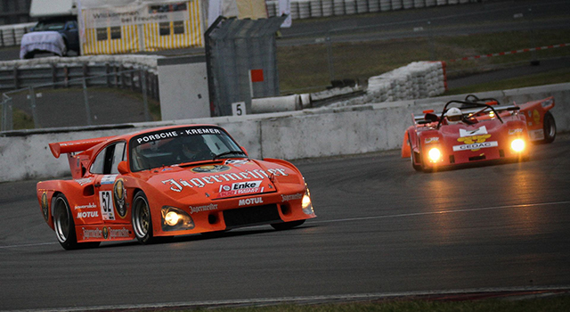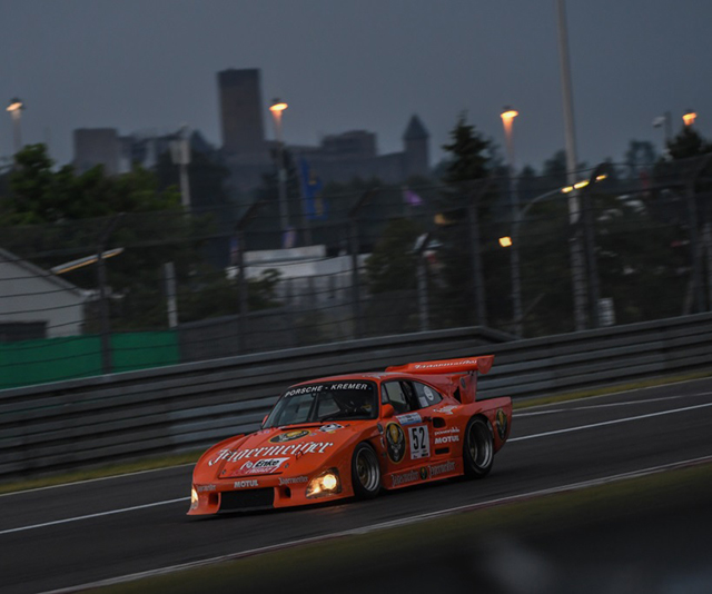 Im ersten Qualifying nahm sich Kaufmann noch zurück, die Komponenten des frisch revidierten Kremer Porsche 935 K3 mussten erst eingefahren und noch einige Optimierungen erledigt werden. Doch im zweiten Zeittraining konnte „Piranha“ seine Zähne zeigen und stellte den Gruppe 5 Porsche auf die Pole Position. Vom ersten Startplatz aus stürmte Kaufmann am Samstagabend um 18.30 in den ersten Abschnitt der FHR 100 Meilen Trophy. Dank gut eingestelltem Auto und ordentlich Turbo Power verteidigte Wolfgang Kaufmann die Führung über 17 Runden. Ein Spaziergang sollte der Sieg im Zwischenklassement jedoch nicht werden. „Vor allem Felix Haas im Cheetah Sportprototyp saß mir immer dicht im Nacken, aber das hat schon viel Spaß gemacht“, erklärte Kaufmann die Lage in Lauf 1. „Der Porsche ist schwerer und hat als Auto nach GT Reglement eine im Vergleich zu Gewicht und Leistung relativ kleine Bremse. Da muss man auch im Zweikampf gut auf die Technik achten.“ Mit zum Rennenden zunehmenden Aussetzern des Doppelturbo Motors und somit Leistungsverlust kam ein Kampf an einer zweiten Front dazu. Mit 0,8 Sekunden Vorsprung überquerte der Westerwälder Profi als Erster die Ziellinie.