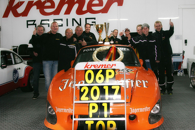 Schwierig dann die Bedingungen vor dem ersten Lauf am Samstag. „Ich habe ständig auf die Wolken geachtet, bin die Boxengasse rauf und runtergelaufen“, berichtete Kaufmann. „Der Himmel war im Hintergrund schon richtig schwarz, aber es kam anfangs nichts.“ Aber auf den Regen in der Eifel ist Verlass und die Wahl Regenreifen aufzuziehen stellte sich als goldrichtig heraus. Auf nassen Geläuf wurde das Feld ins Rennen geschickt und Kaufmann zeigte seine ganze Kunst am Volant des Kremer Racing Porsche 935 K3. Souverän führte er das Feld an und setzte sich im Verlauf der 13 Rennrunden sukzessive von der Konkurrenz ab. Was nicht hieß, dass es so leicht war wie es aussah: „Die Ideallinie begann im Laufe des Rennens abzutrocknen, ich musste mit den Regenreifen immer mal wieder die Spur wechseln“, erklärte Kaufmann die Lage im ersten Rennen. „Dazu hat ein Teilnehmer beständig Öl verloren und eine schöne Spur über die ganze Runde gelegt. Feucht und Öl ist keine besonders angenehme Kombination“. Doch den Sieg mit rund 23 Sekunden Vorsprung gefährdete auch das nicht. „Mein dritter Sieg in diesem Jahr mit dem wunderschönen, optimal vom Team Porsche Kremer Racing vorbereiteten Jägermeister 935 K3", jubelte Kaufmann im Ziel.