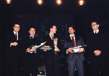 Wolfgang Kaufmann - Porsche Weltcup Gewinner 2001 - zusammen mit Wolfgang Dürrheimer, dem Zweitplatzierten Patrice Gouselard (F), dem Drittplazierten Fabio Babini (I) und dem heutigen Porsche Sportchef Hartmut Kristen (v.l.n.r)