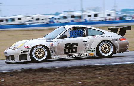 Freisinger Porsche 996 GT 3 R beim 24h Rennen Daytona 2001 mit den Piloten Wolfgang Kaufmann, dem Amerikaner Lance Stewart und dem Franzosen Cyril Chateau